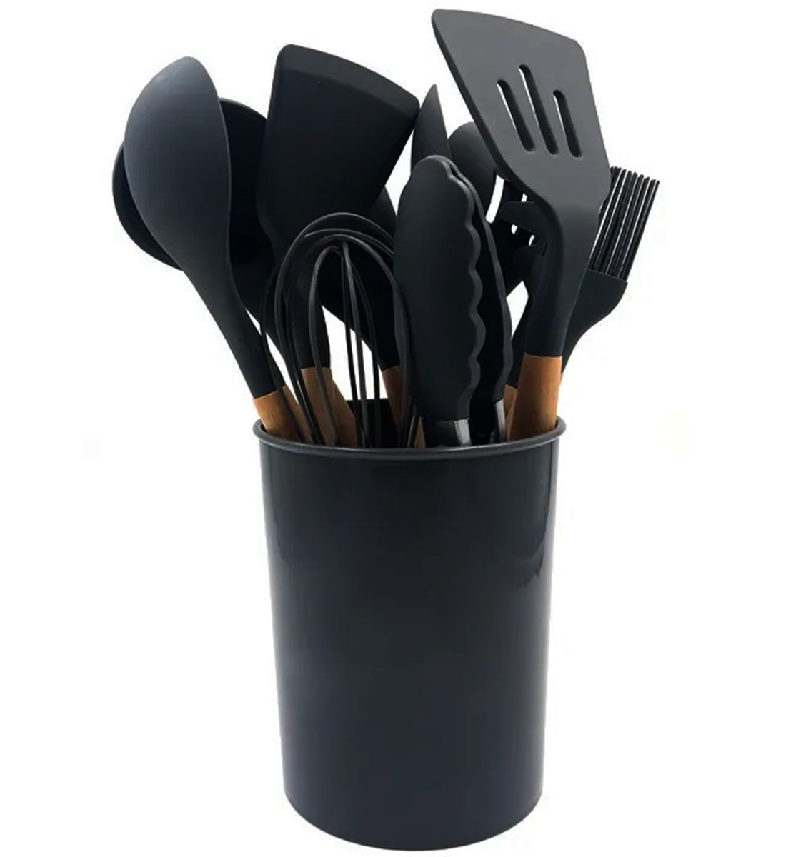 Virtuves piederumu komplekts, 12 gab., koks un silikons, melni-brūni