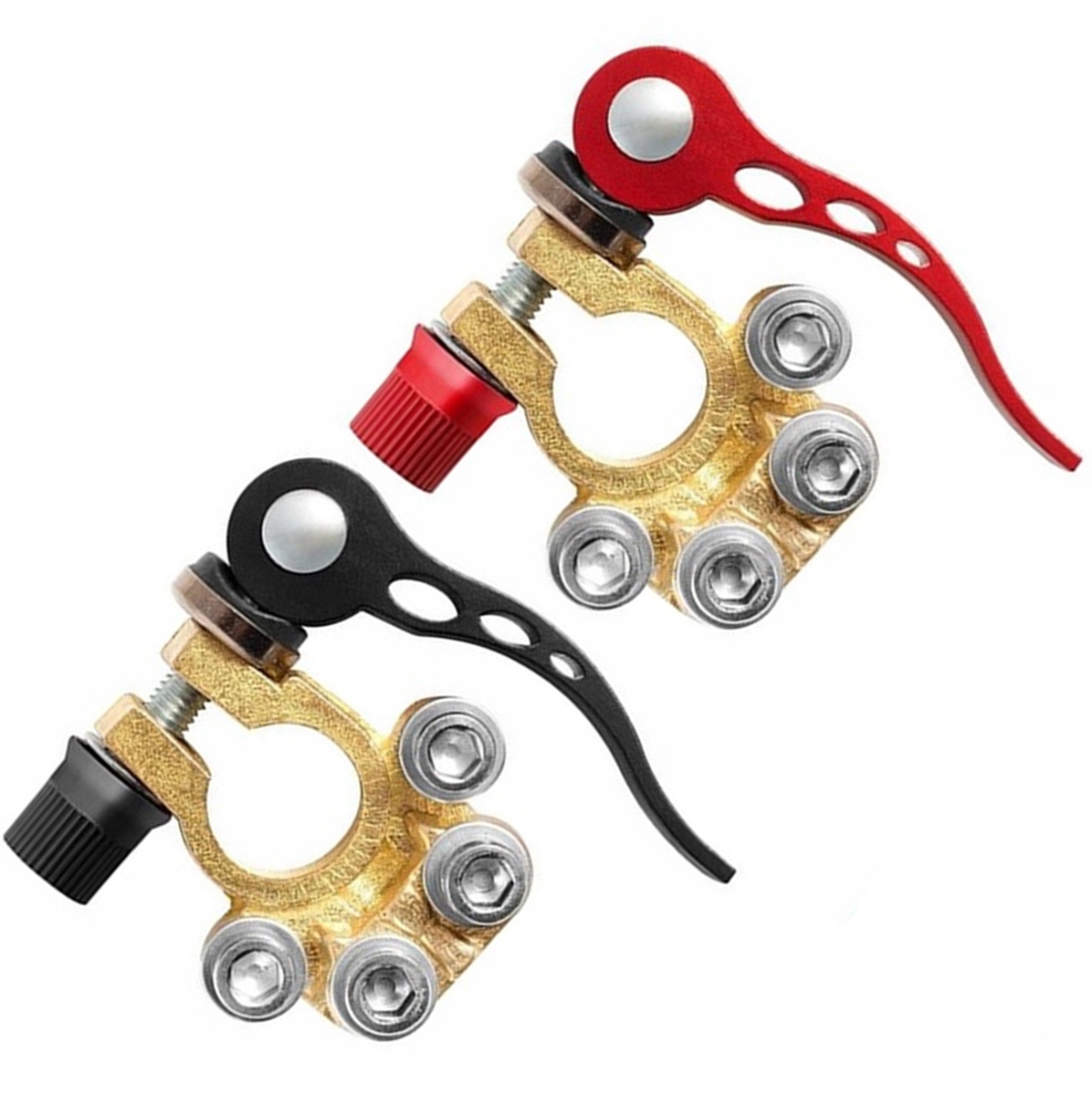 Set of two pieces terminal clamps (positive and negative). Universal - fit 6V 12V batteries. They allow you to instantly disconnect connect the battery. Installation is very simple just reposition wires from existing factory clamps, using a flat wrench 8 / 10 mm.