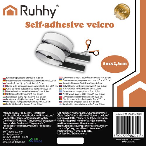 Self-Adhesive Hook and Loop Tape Ruhhy 24237, 5m x 2.5cm, black
