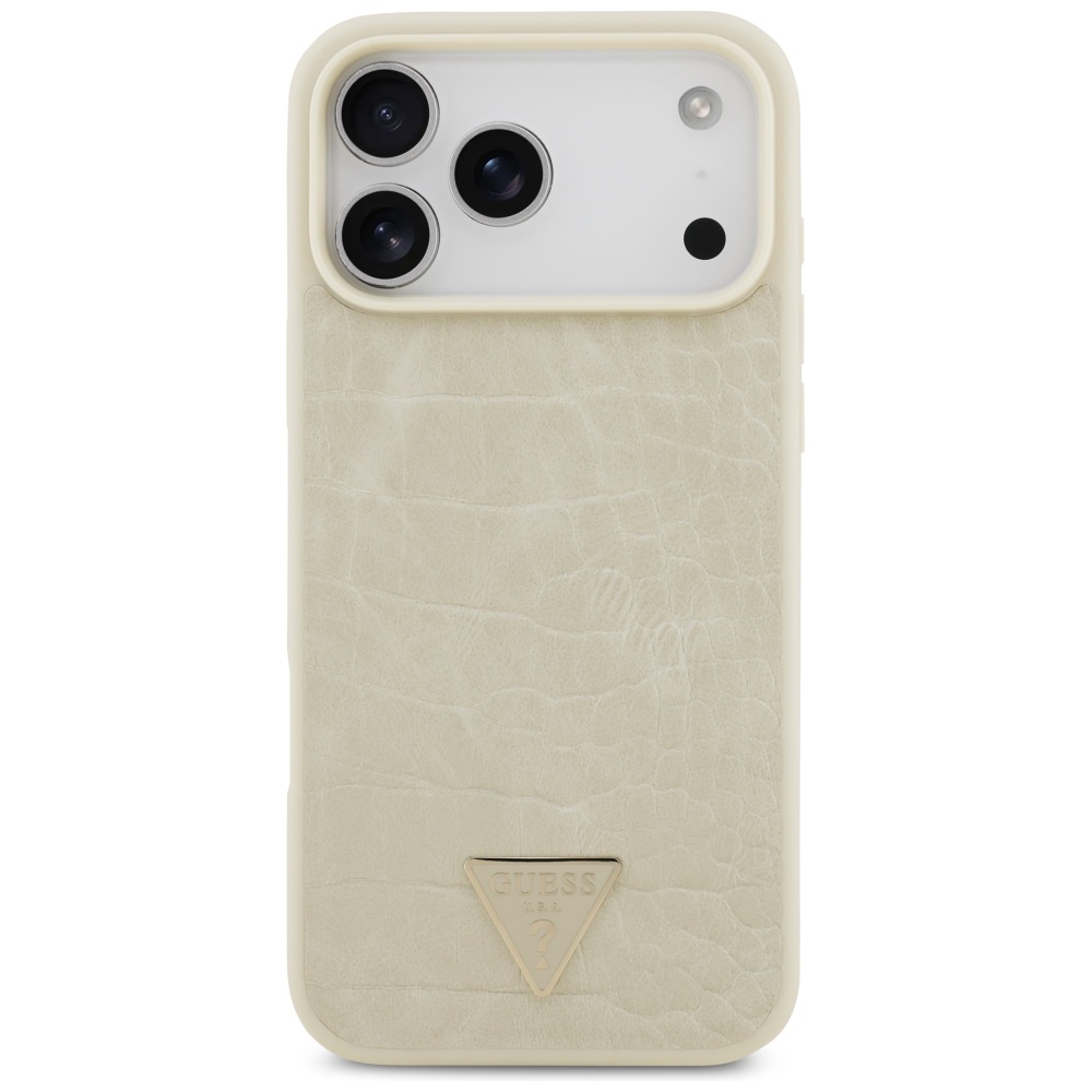 Elevate your iPhone 17 Pro Max with the Guess Croco Triangle Logo MagSafe Case in Gold—premium protection that doubles as a style statement. Tired of bulky phone cases or weak magnetic connections? This slim hardcase pairs crocodile-pattern eco-leather with reinforced edges and precision cutouts, while built-in MagSafe magnets snap securely to chargers and accessories for fast, effortless power. Flexible sides make installation easy, raised bezels shield the screen and camera, and the iconic Guess badge adds a polished finish. Add this iPhone 17 Pro Max phone case to your cart and get style, grip, and MagSafe convenience in one.