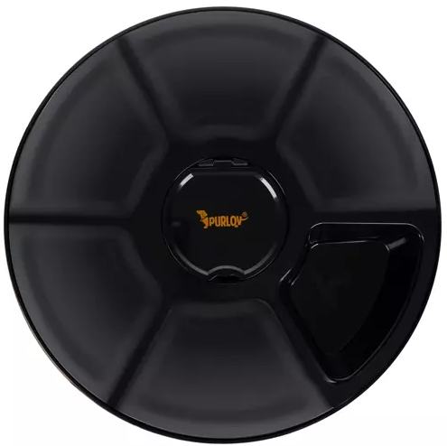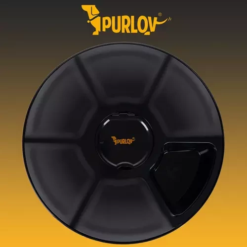 - The feeder has 6 chambers with a capacity of 150 ml each. 5 are covered and one is open. Timed opening system when turning the lid opens one chamber with food at a certain time .
