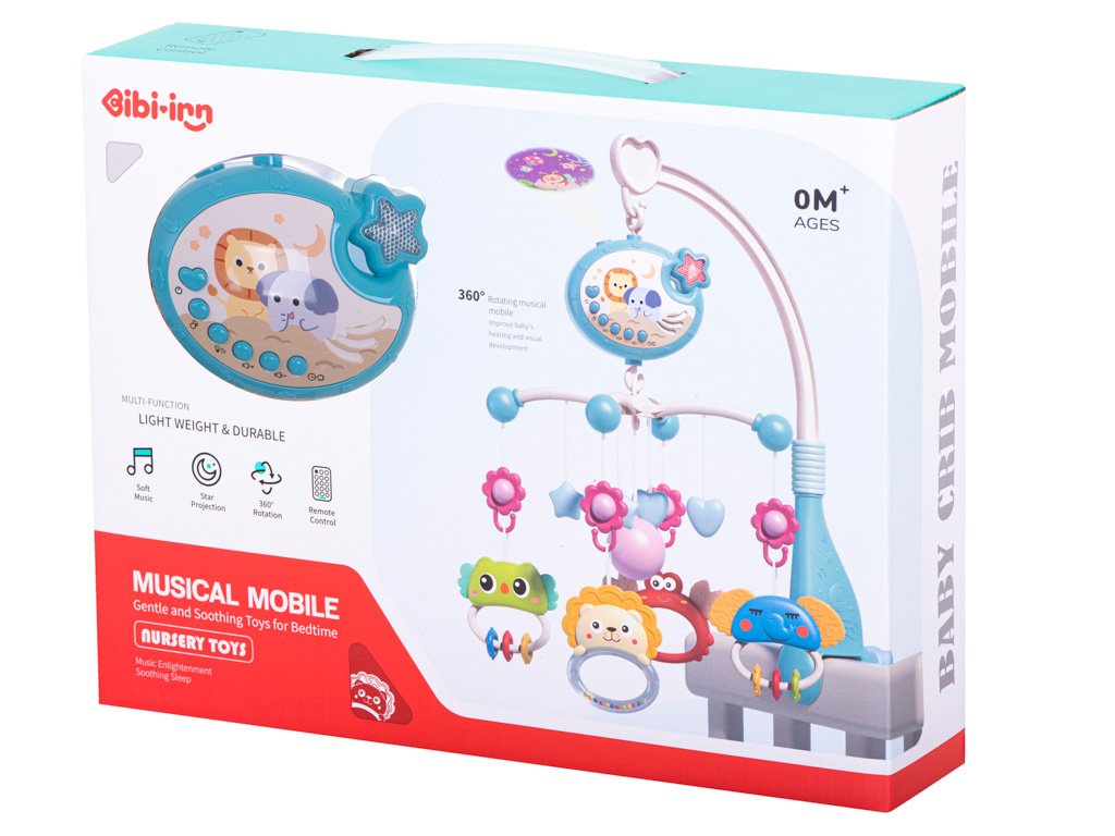 After pressing the button on the remote control, the carousel begins to rotate, and the animals entertain the baby. As many as 40 different melodies to choose from will satisfy the needs and tastes of every baby. There are buttons to adjust the volume. After pressing the button, the star projector will immediately light up the room, and beautiful images will appear on the ceiling. The timer will allow you to run the carousel for 20, 40 or 60 minutes.