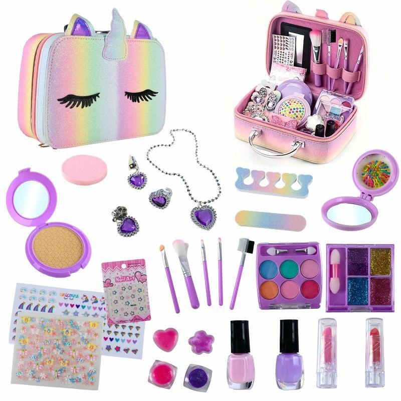 Cosmetic set for children in a zippered trunk. All cosmetics are made of safe substances and wash off easily.