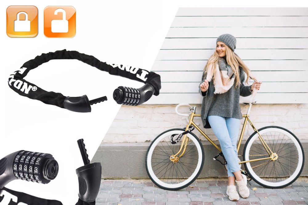 High quality bike lock with code. Made of oval shaped links, with a protective sleeve from scratches, closed with a combination lock.