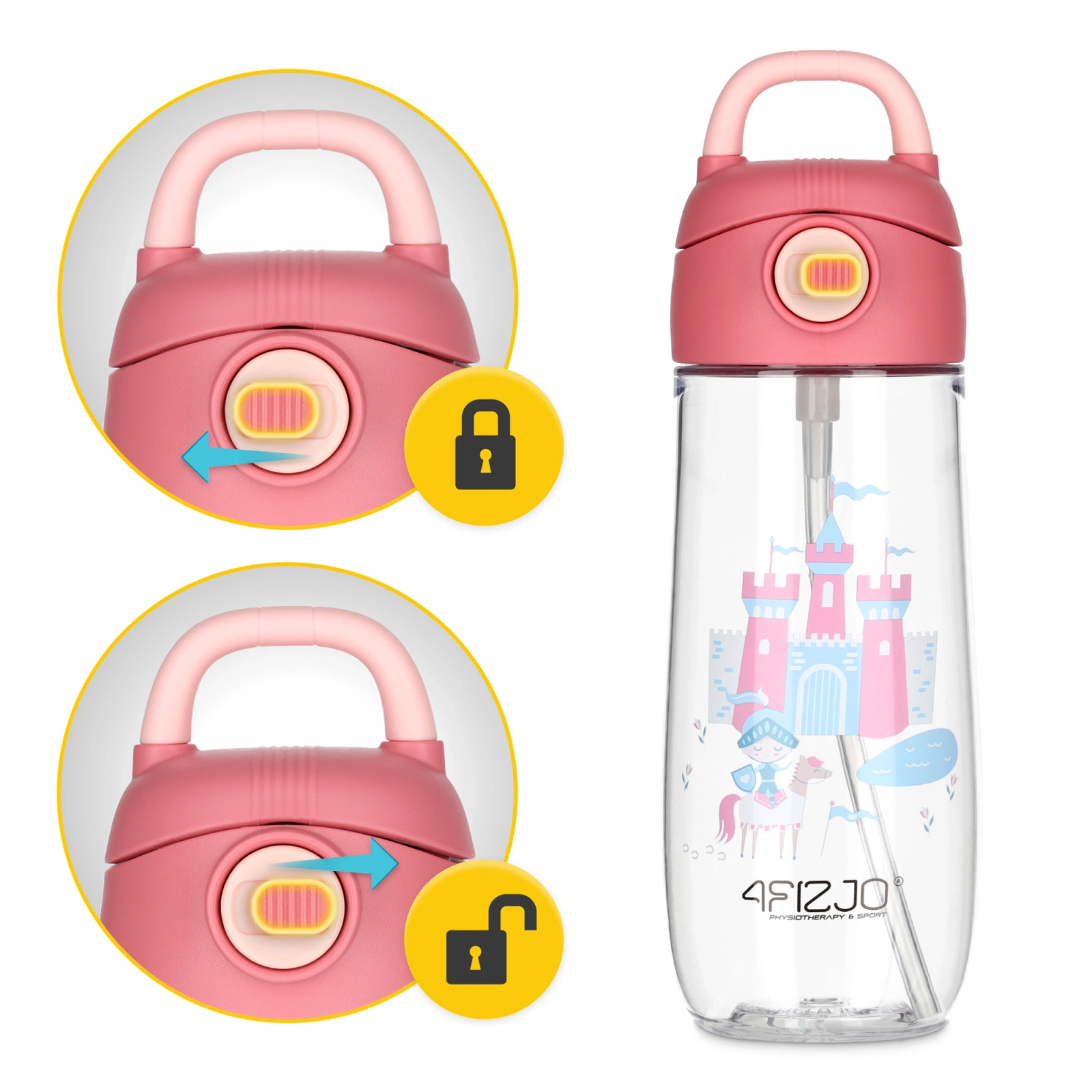 The 4Fizjo Zamek kids water bottle is a lightweight, leak-proof, and colorful bottle designed for convenient everyday use. It is perfect for school, kindergarten, training, or trips, helping to keep your child hydrated.