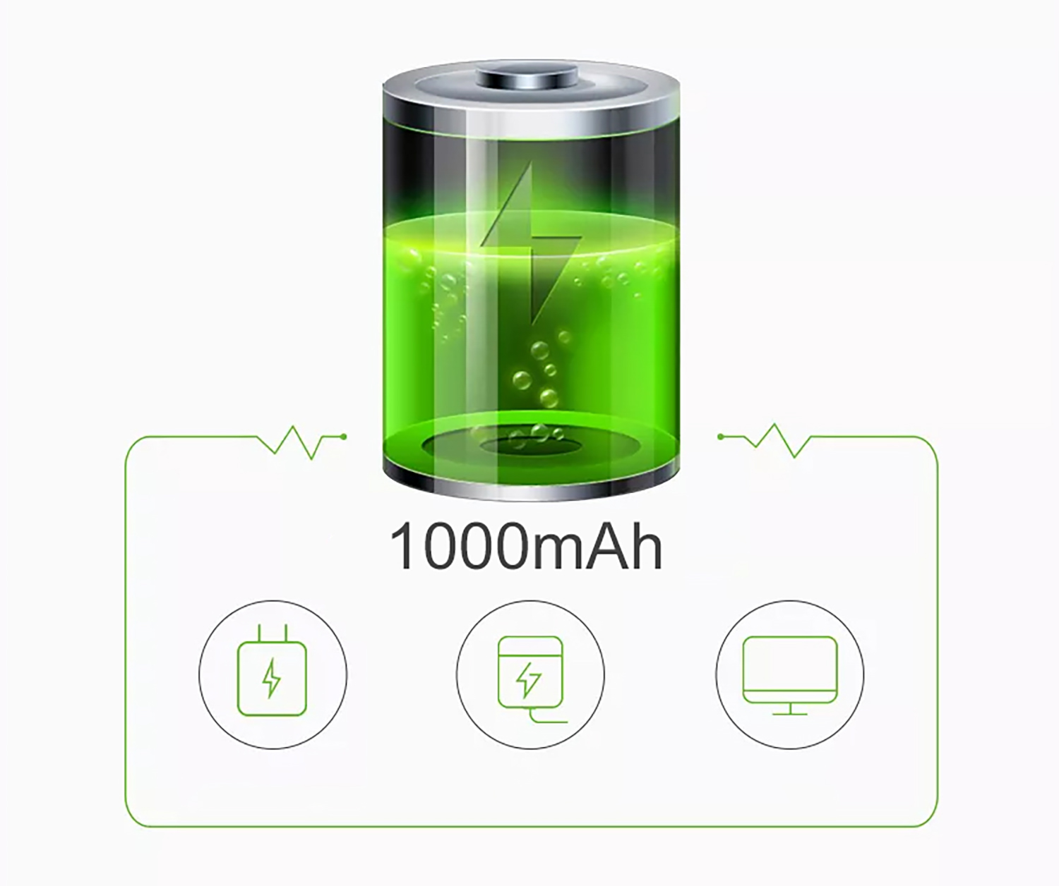 The device is wireless and can be easily charged by connecting the cable to a standard charger (e.g., from a phone). It can also be charged via a power bank, computer, or other devices. A full charge provides 2.5 to 3 hours of continuous operation.