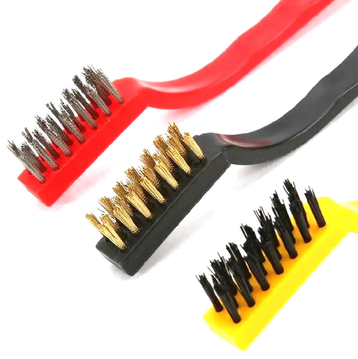 A set of three wire technical brushes. They are perfect for removing various types dirt. Long handles with perforations comfortable contouring significantly increase the comfort use. The brushes made suitable applications. steel brush perfectly cleans rust and paint coatings. brass softer soft alloy surfaces. nylon flexible bristles is designed maintenance hard-to-reach areas.