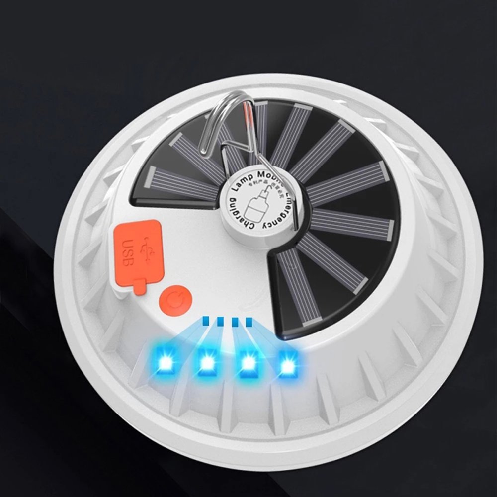 Functional camping lamp powered by a built-in battery and solar panel. With 60 LED lights, it provides bright illumination and is ideal for use in tents or outdoors. The lamp is dustproof, shock-resistant, and splash-proof (IP65), making it reliable in various weather conditions. The integrated handle allows for easy carrying or hanging. Multiple lighting modes and adjustable brightness let you customize the light. The built-in USB port enables charging of other devices, such as your phone.