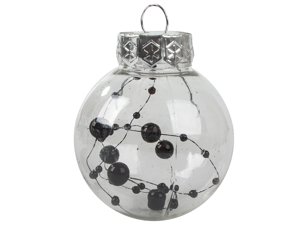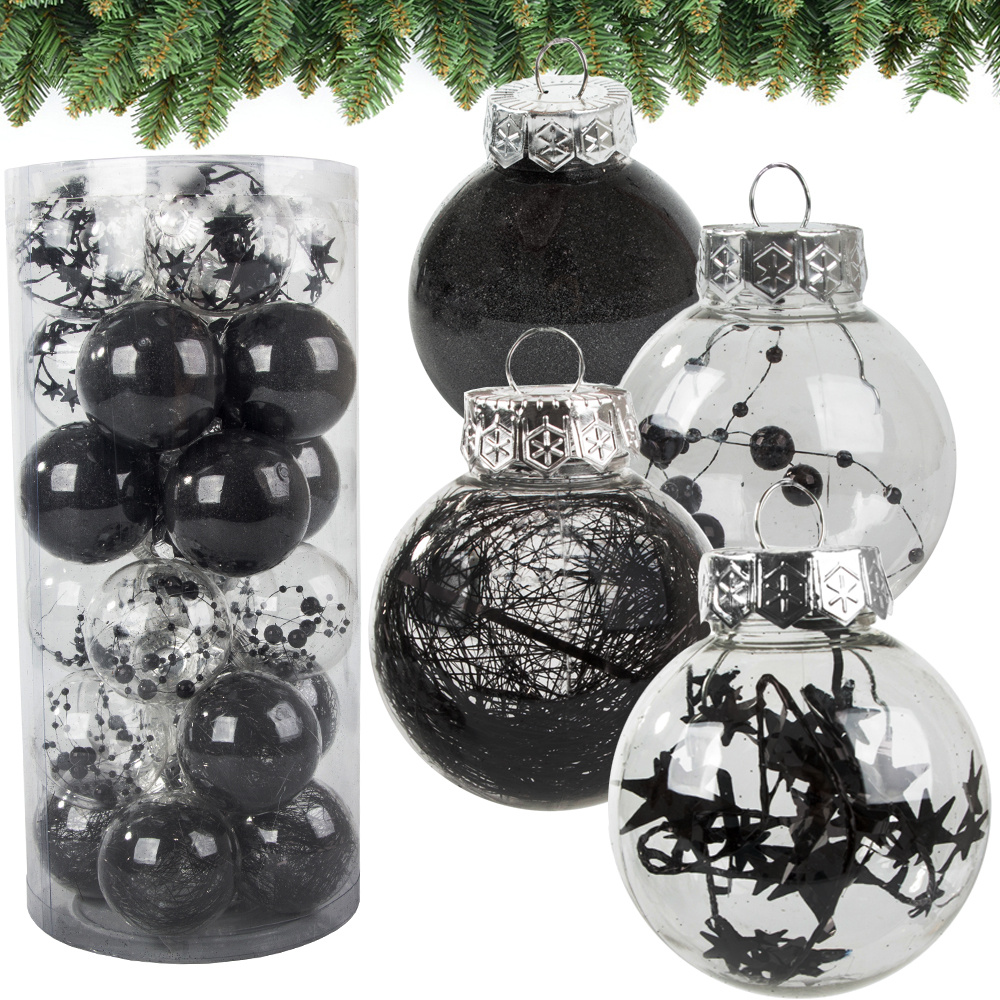 A set of Christmas tree baubles consisting of 24 black and transparent baubles, 6 cm in diameter. These shatterproof ornaments are ideal for decorating your festive tree and wreaths.