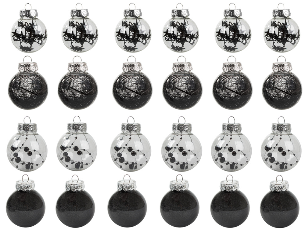 The set includes 6 black baubles with glitter, 6 transparent with black balls inside, 6 black with threads, and 6 transparent with black stars.