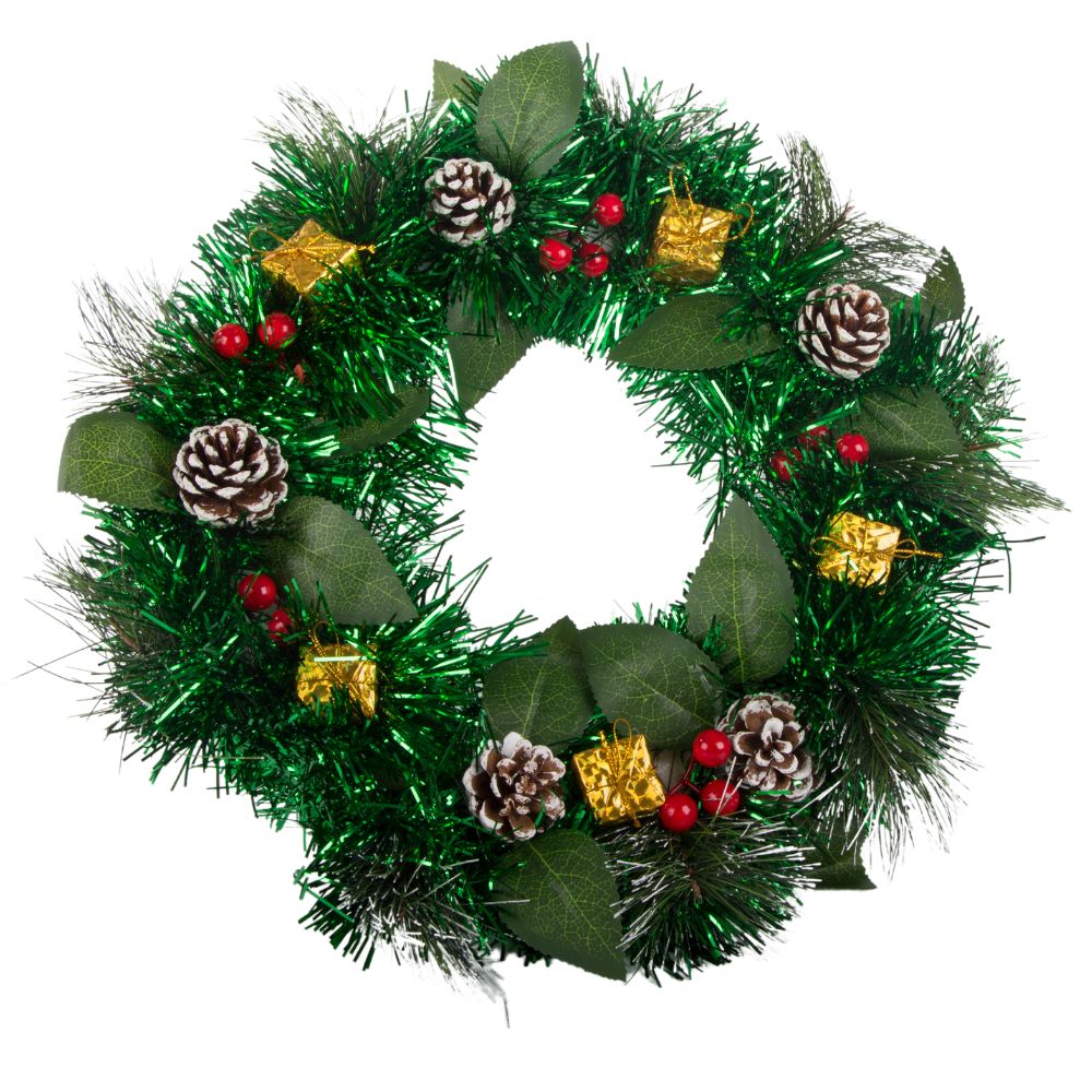 This Christmas wreath with decorations is a great holiday decor piece that will bring the Christmas spirit into your home. It is suitable for both indoor and outdoor use.
