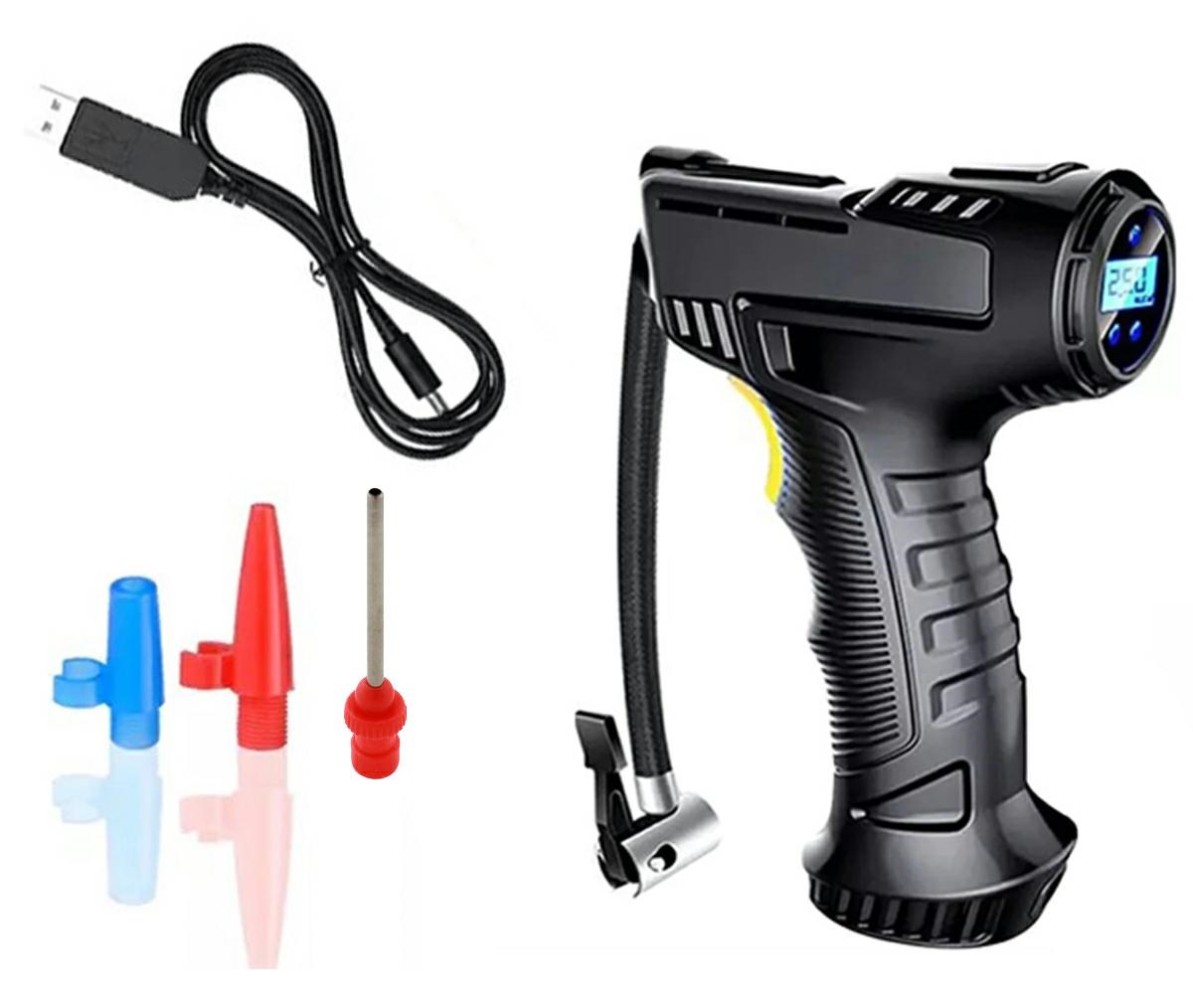 Compact, cordless tire inflation compressor. Powered by a built-in rechargeable battery, charged via USB cable (included). Comfortable handle makes it easy to inflate wheels, while the easy-to-read LCD display set dedicated air pressure and change units. A convenient, flexible hose additional interchangeable tips (3 pieces) make use.