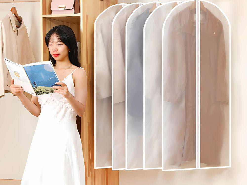 Large garment bag 60x137 cm with zipper protects suits, dresses and coats from dust, moisture and damage. Durable PEVA fabric ensures long-term use.