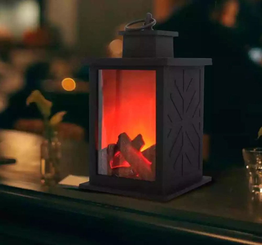Portable LED lantern imitating a fireplace flame. It will be perfect as decorative item or gift idea. Built-in LEDs faithfully imitate the effect of flame by displaying soothing in real fireplace. The is equipped with built-in timer (6h work / 18h break). also has special handle that allows you to hang it anywhere and carry conveniently.