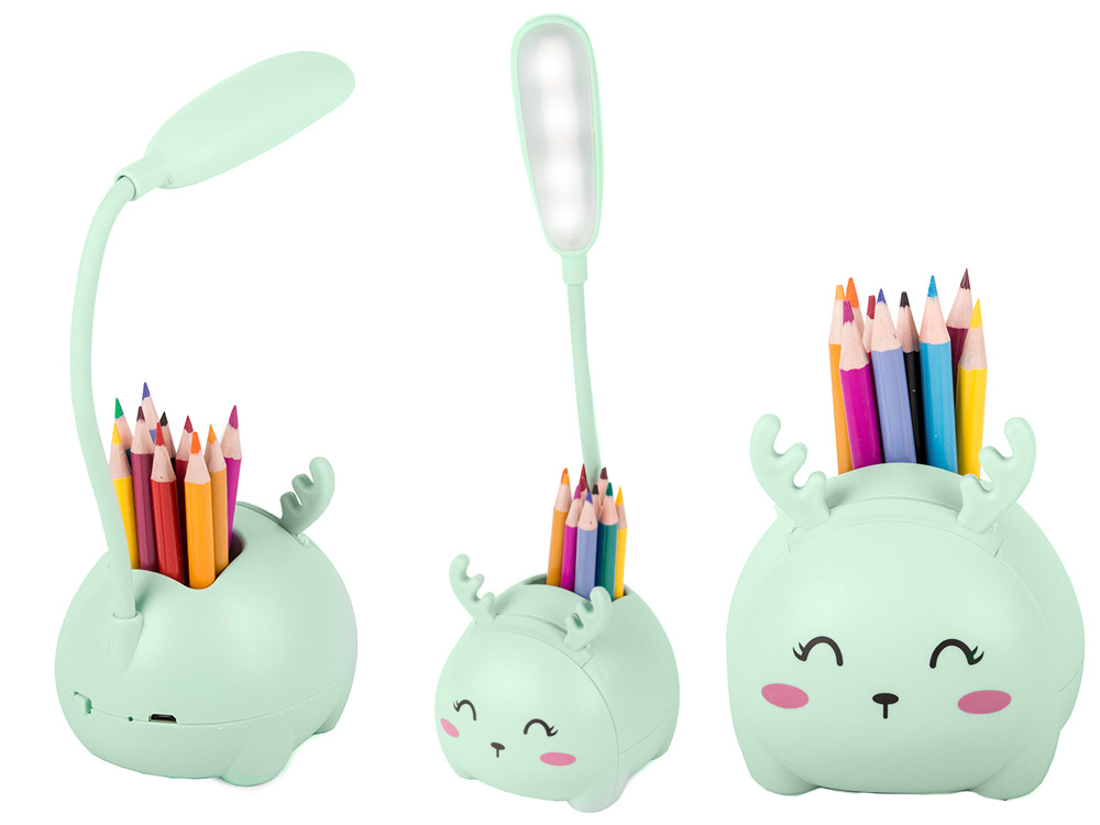 A green kids LED night light in an animal shape, combining illumination with a practical pen organizer and phone stand. A great addition to a child's room for reading, studying, or as a gentle night light.