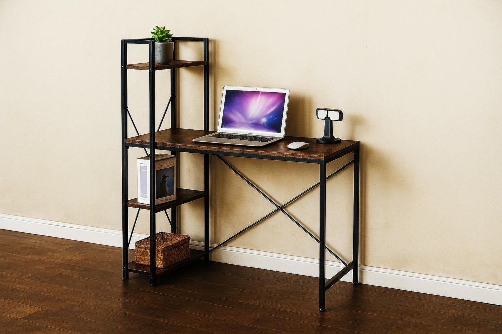 Designed for both style and functionality, this computer desk features a stable metal frame and a durable wood-finish top, giving it an elegant and versatile look that complements any decor. The integrated shelving unit offers three generous shelves for all your essentials. A key feature is its reversible design, allowing you to assemble the shelves on either the left or right side to perfectly fit your room's layout.