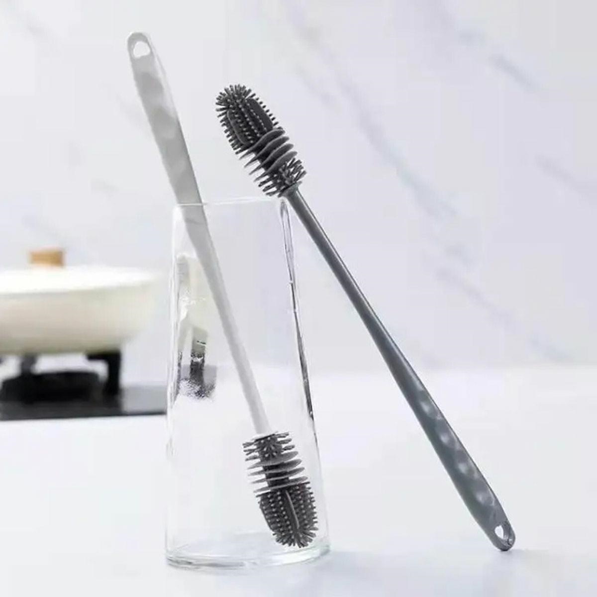 Silicone brush for washing glasses and bottles. Silicone bristles perfectly collect dirt without damaging the surface of the dish. The long handle makes it easy to wash dishes.