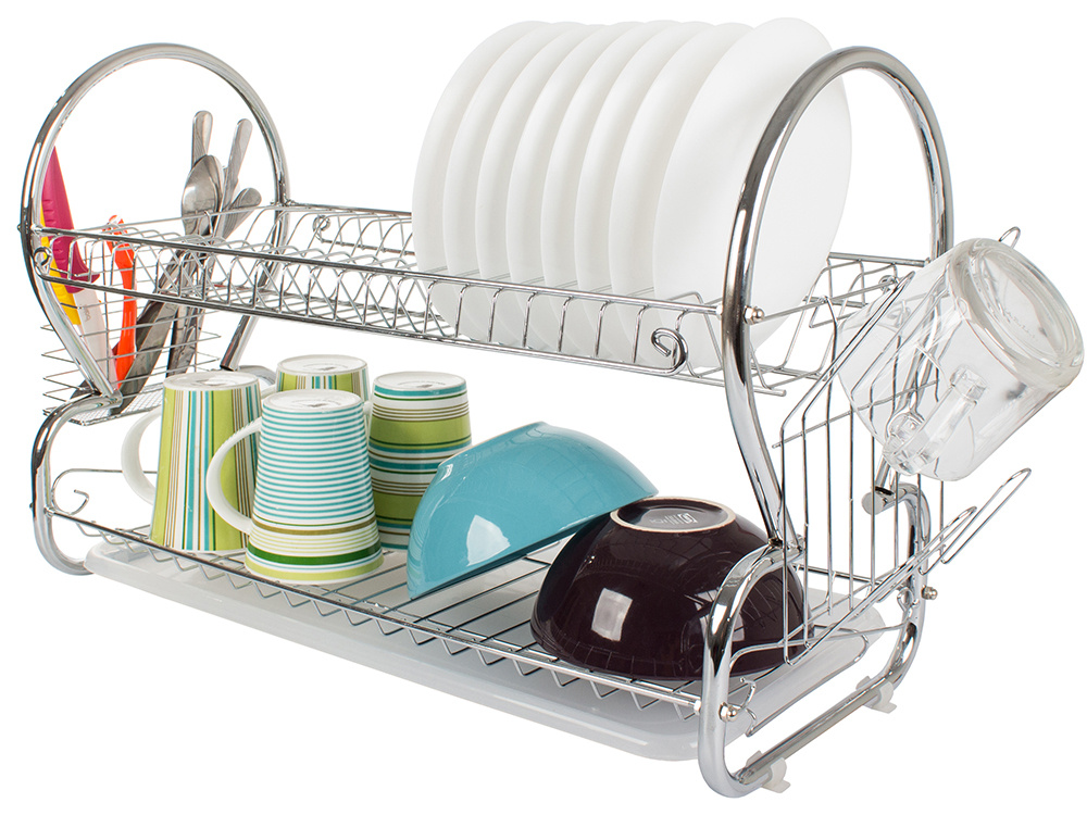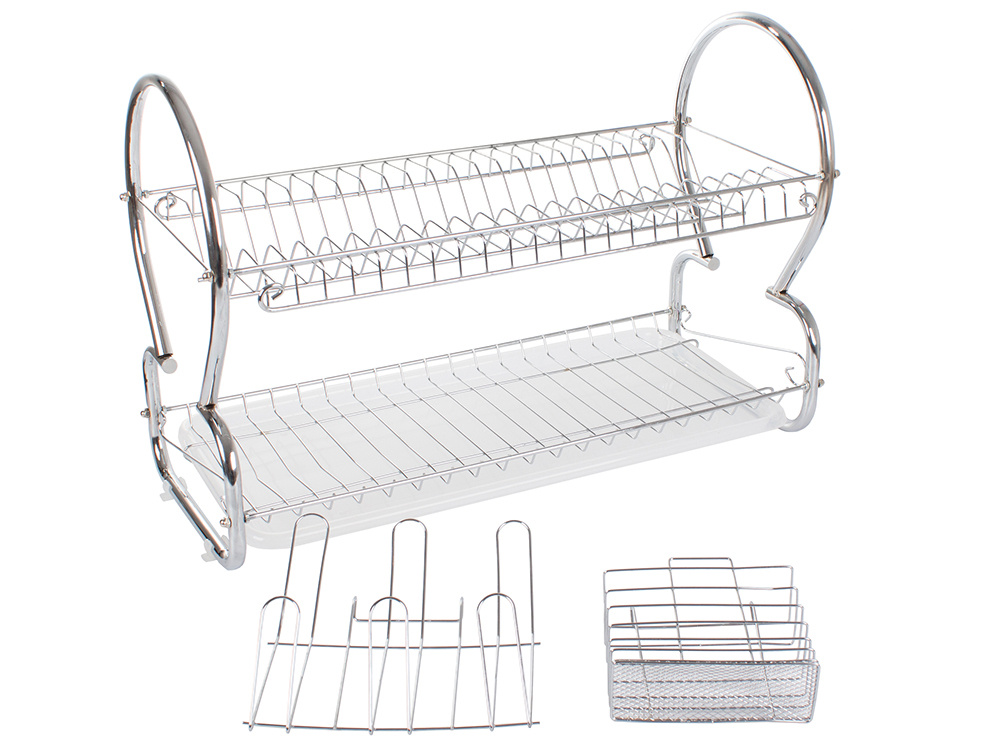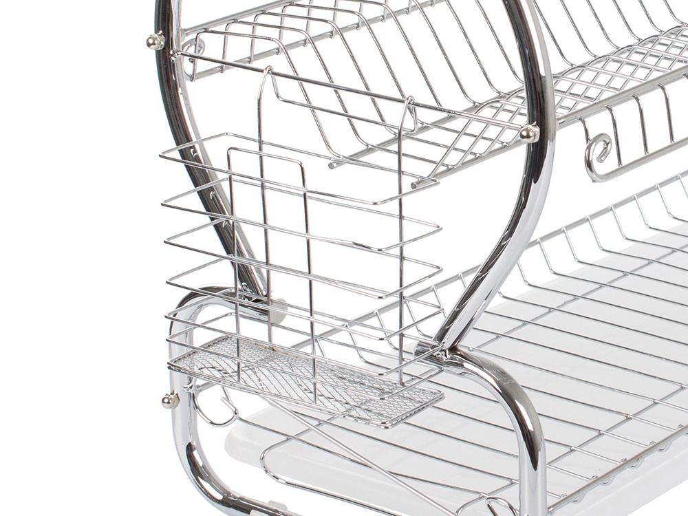 The two-tier dish rack is an essential accessory for any kitchen. It is highly practical, featuring two levels that can accommodate a large number of plates, bowls, or glasses. Additionally, the rack includes two hanging holders: one for cutlery and the other for glasses or goblets.