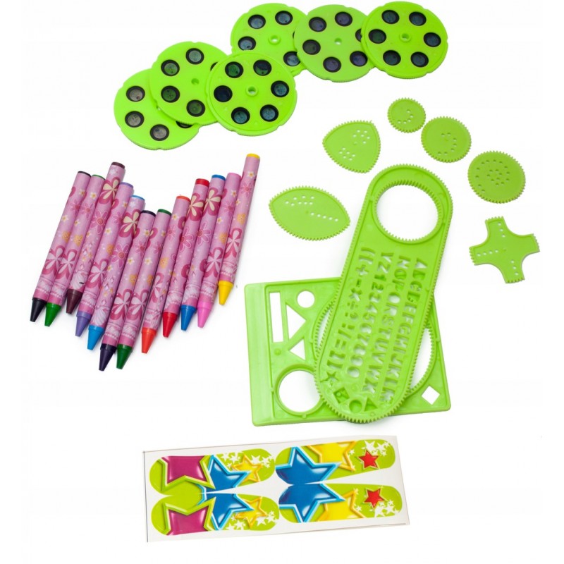 At the base of the projector there are special holes for crayons and discs. In the set you will also find special stencils with which you can create whimsical patterns.