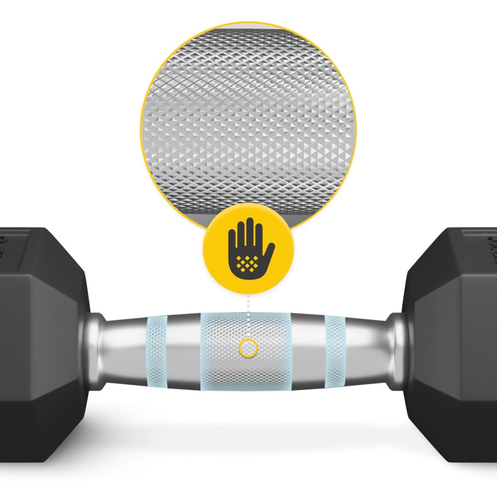 - Steel filling: ensures the dumbbell's durability, longevity, and compact size.