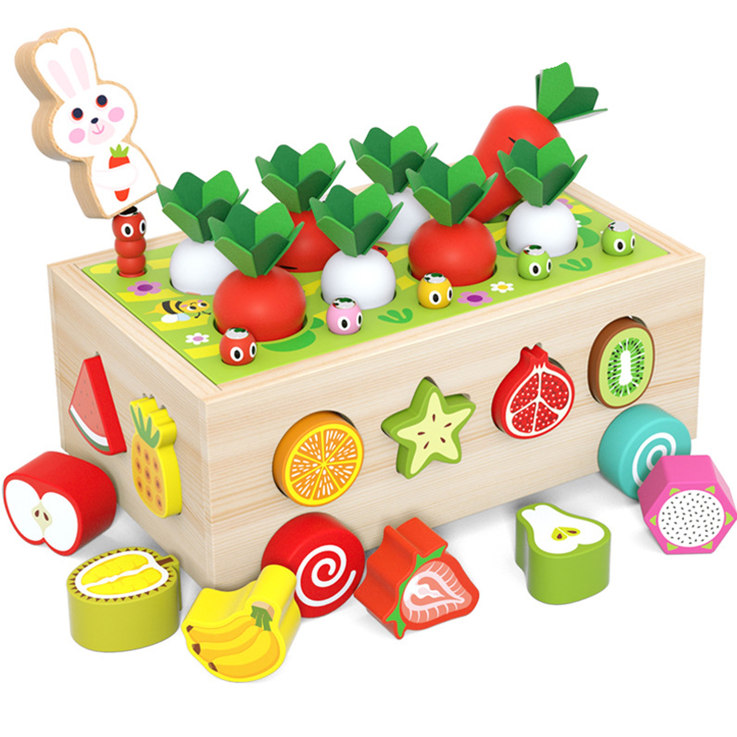 The sides of the sorter feature holes shaped like various fruits and vegetables. Your child will love matching the wooden blocks to the correct slots, making it a fun way to learn about different shapes and foods. It's also a great opportunity to teach them the names of fruits and veggies.