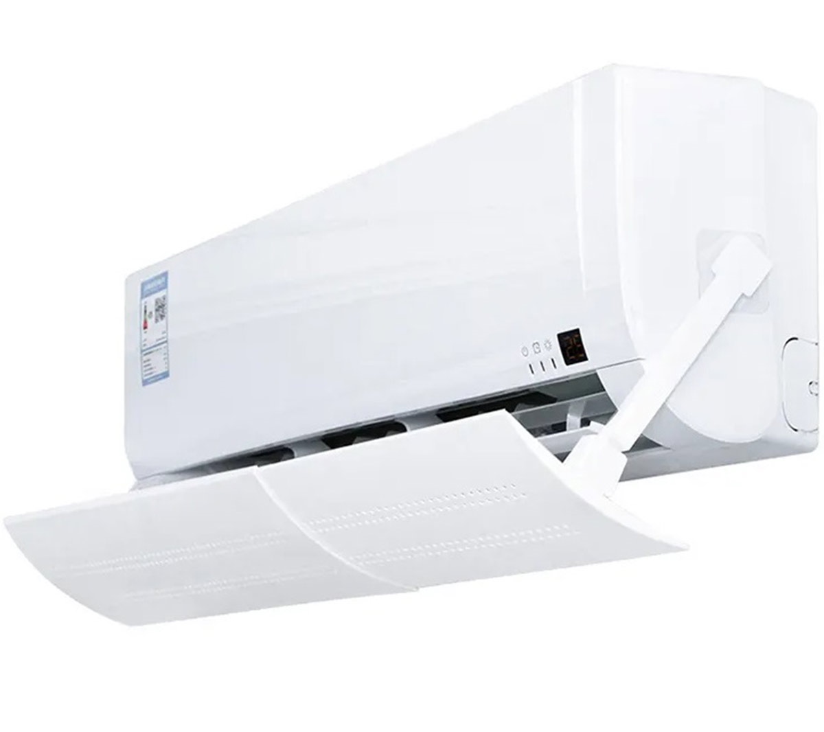 Cover for the front panel of the split type indoor air conditioner. It perfectly protects against excessive gusts of cold air and reduces the risk of wind chills and colds. The cover has additional holes to ensure even air flow from the air conditioner. Equipped with mounting elements that facilitate its attachment to the housing of the air conditioner.