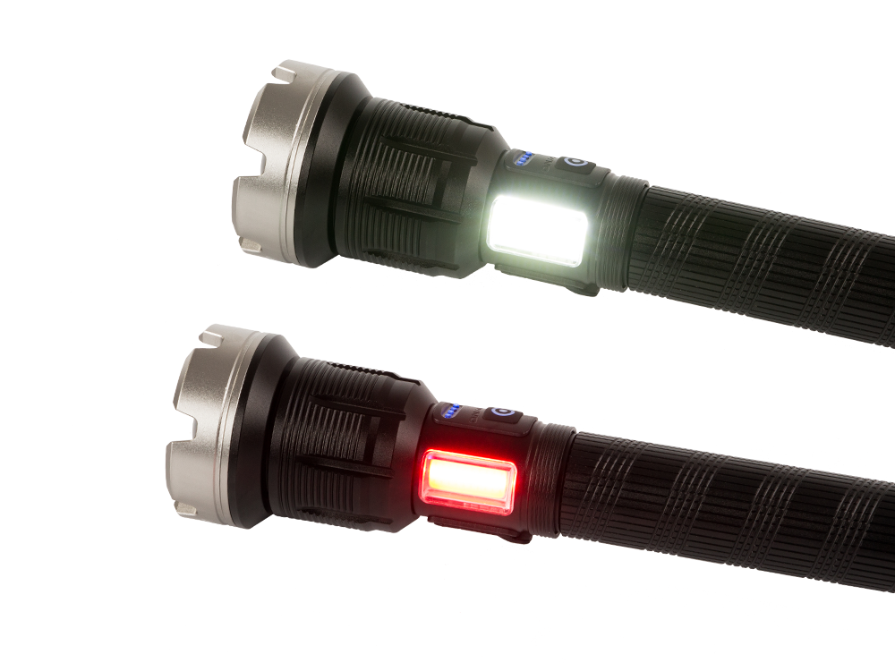 Equipped with a powerful CREE XHP90 LED with up to 100,000 hours lifespan. A side light offers both red and white illumination.