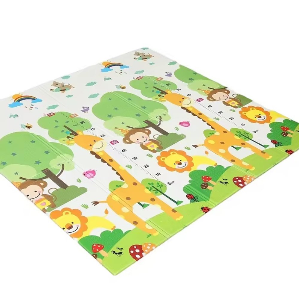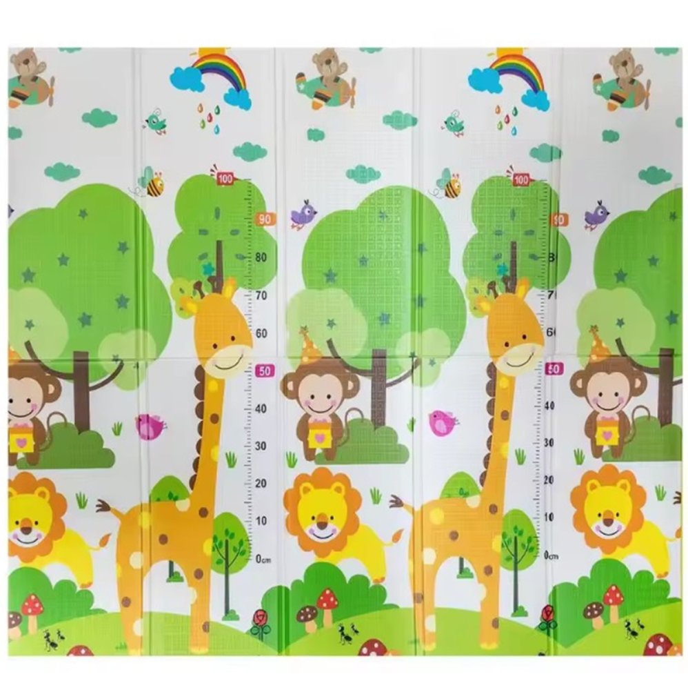 Spacious double-sided foam play mat with educational prints, measuring 200 x 180 cm. Perfect for indoor and outdoor use thanks to durable, child-safe EVA foam. The large surface offers plenty of room for play and learning. One side features a colorful giraffe game board with a height chart, the other a magical forest scene. Easy to clean and ideal for any playroom or nursery.