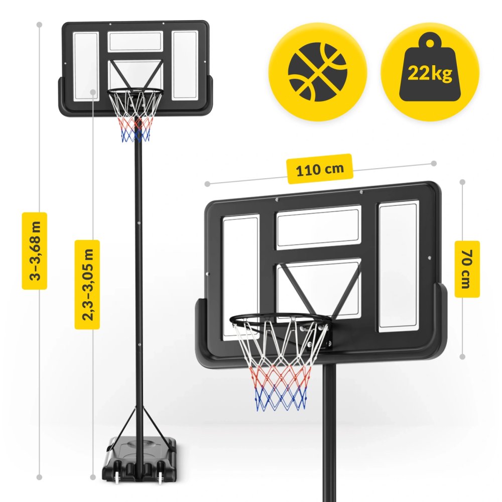 - Adjustable height: The rim height can be adjusted from 2.3 to 3.05 meters (official height).