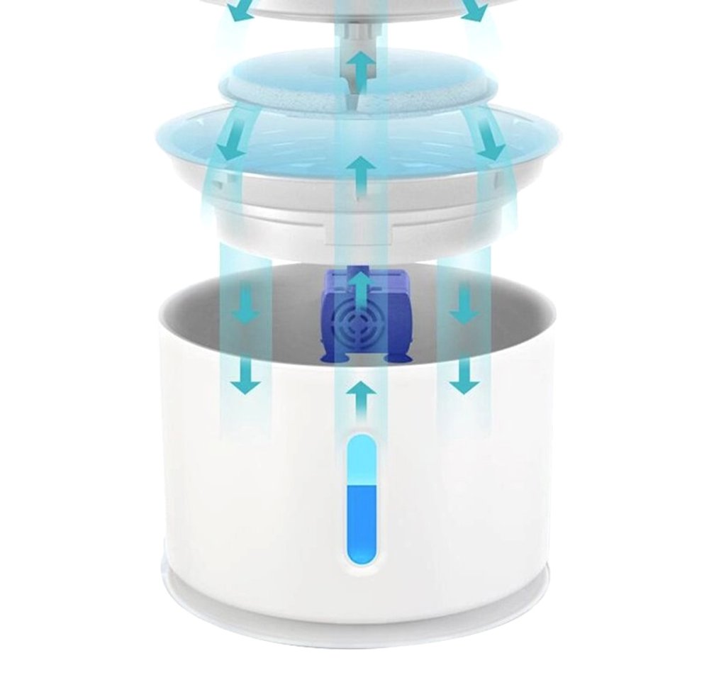 Automatic waterer for pets. Attractive fountain-shaped design. A large water tank with a capacity of up to 2.4 liters ensures long-term use. The filter system (with a replaceable filters) provides fresh and clean water for our pet. The waterer is equipped with a quiet and efficient pump, the device can successfully operate at night. Safety of use is increased by automatic shutdown and low water level signaling functions (using LED backlight).