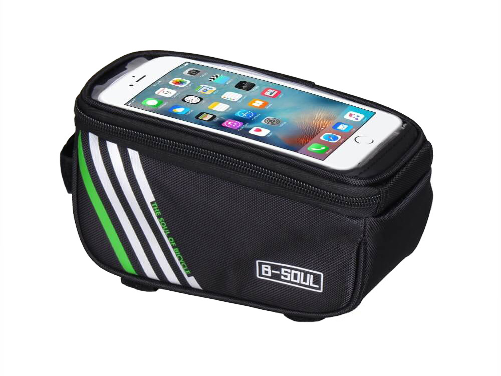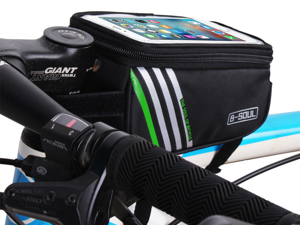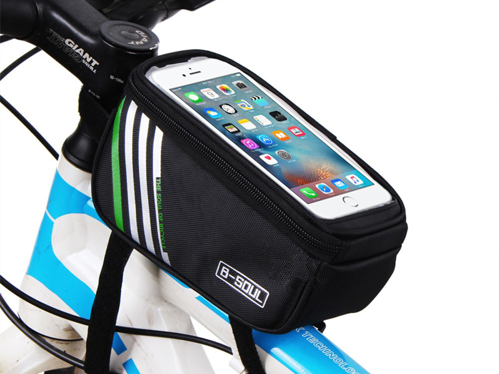 The bag is fully padded and made of durable material. Comfortable to use, it allows you to use all the functions of your phone while cycling without any problems. It is attached to the bike frame with adjustable Velcro fasteners. Holds up to 6.8" devices. It has reflective strips for increased safety on the road.