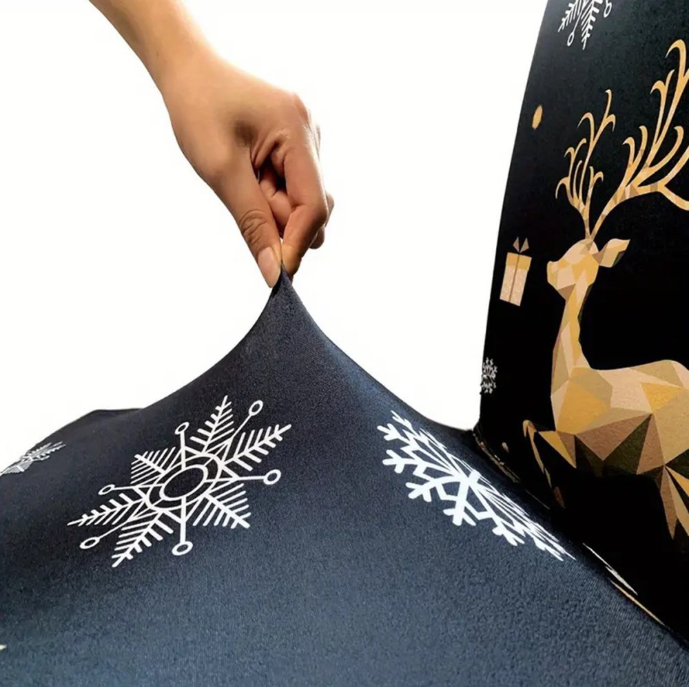 Universal chair cover. Made of pleasant to the touch velour imitation material. High stretchability makes it easy stretch over seat and back different types chairs. Machine washable (at 30 degrees). Attractive Christmas motif (reindeer).
