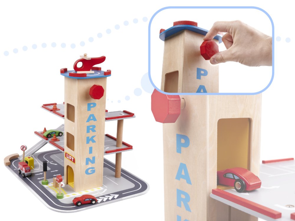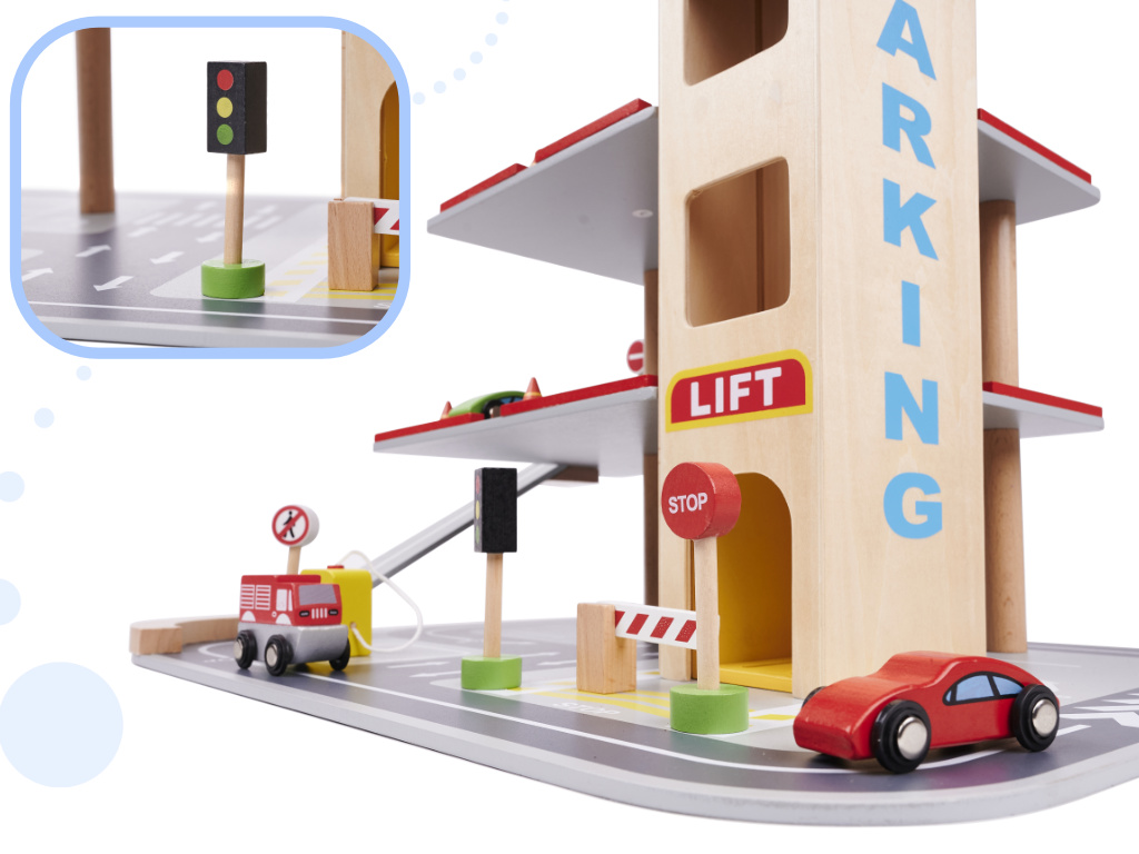 Children Play Wooden Multi-storey Parking Garage with Elevator, Gas Station and Cars