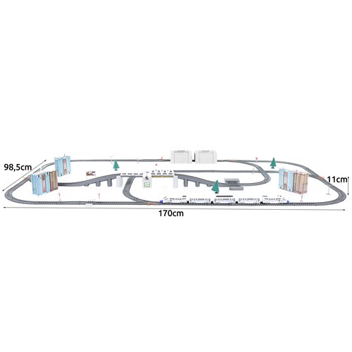 - ELECTRIC RAILWAY 86 ELEMENTS - the set consists of 86 precisely made and nicely finished elements that can be arranged according to your own ideas . The set includes, among others , a track, a train, wagons, a bridge with a lifting arm, a set of trees and signs . The elements of the railway and the train are connected using special hooks that are located at the end of the locomotive and each carriage. The tracks have special levers. Thanks to them, your child can change the route of the machine at any time .