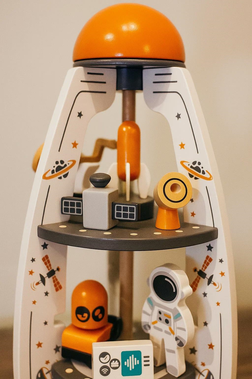 The Gotel B70G wooden rocket is a space-themed sensory toy designed to develop a child's manual skills and logical thinking. It offers a variety of interactive activities in one stable structure.