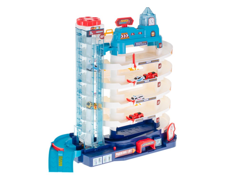 The parking lot has as many as 5 floors designed for parking the cars that you will find in the set. Cars can be lifted up using an automatic lift. The colorful elevator lights will flash as you ride up.