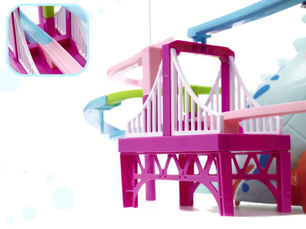 The race track with a dinosaur that swallows little dinosaur cars is great fun for kids. While playing with cars, kids learn about trajectory, speed, distance, gravity, weight and more. The game develops motor skills, hand-eye coordination and dexterity. The toy has sound effects.