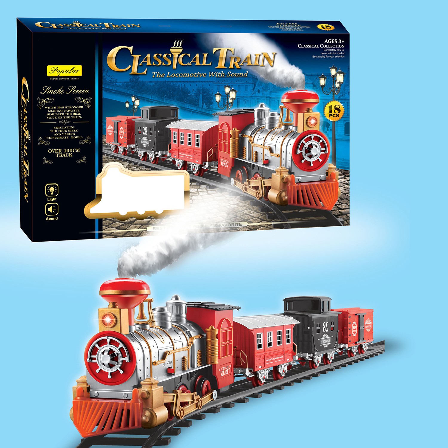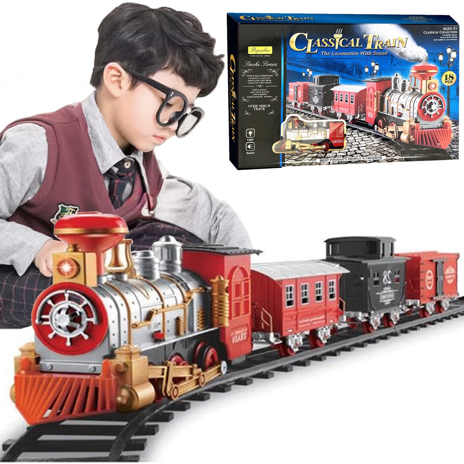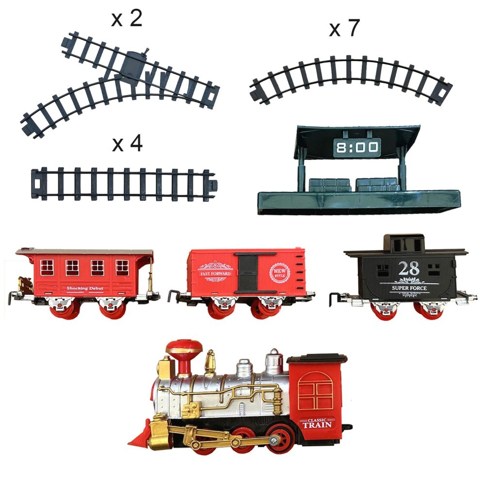 Our train on tracks features realistic sounds and lights that will enrich your child's experience. Watch as the steam locomotive chugs along the tracks, enveloped in a mysterious puff of smoke from its chimney.