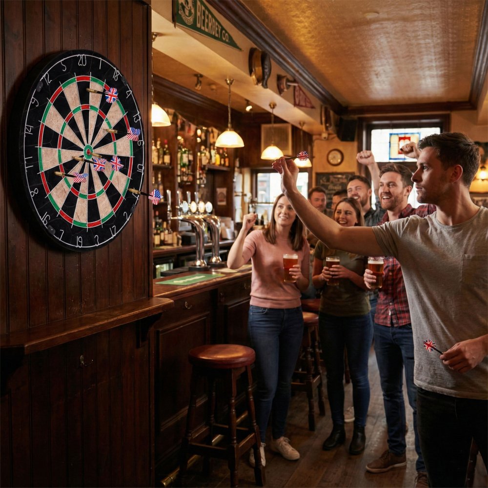 The set includes 6 balanced, steel-tip darts with durable shafts and decorative flights featuring the flags of the USA and the UK, making it easy to distinguish between teams or players. Thanks to their solid construction and balanced weight, these darts feel great in your hand and allow for accurate, consistent throws.