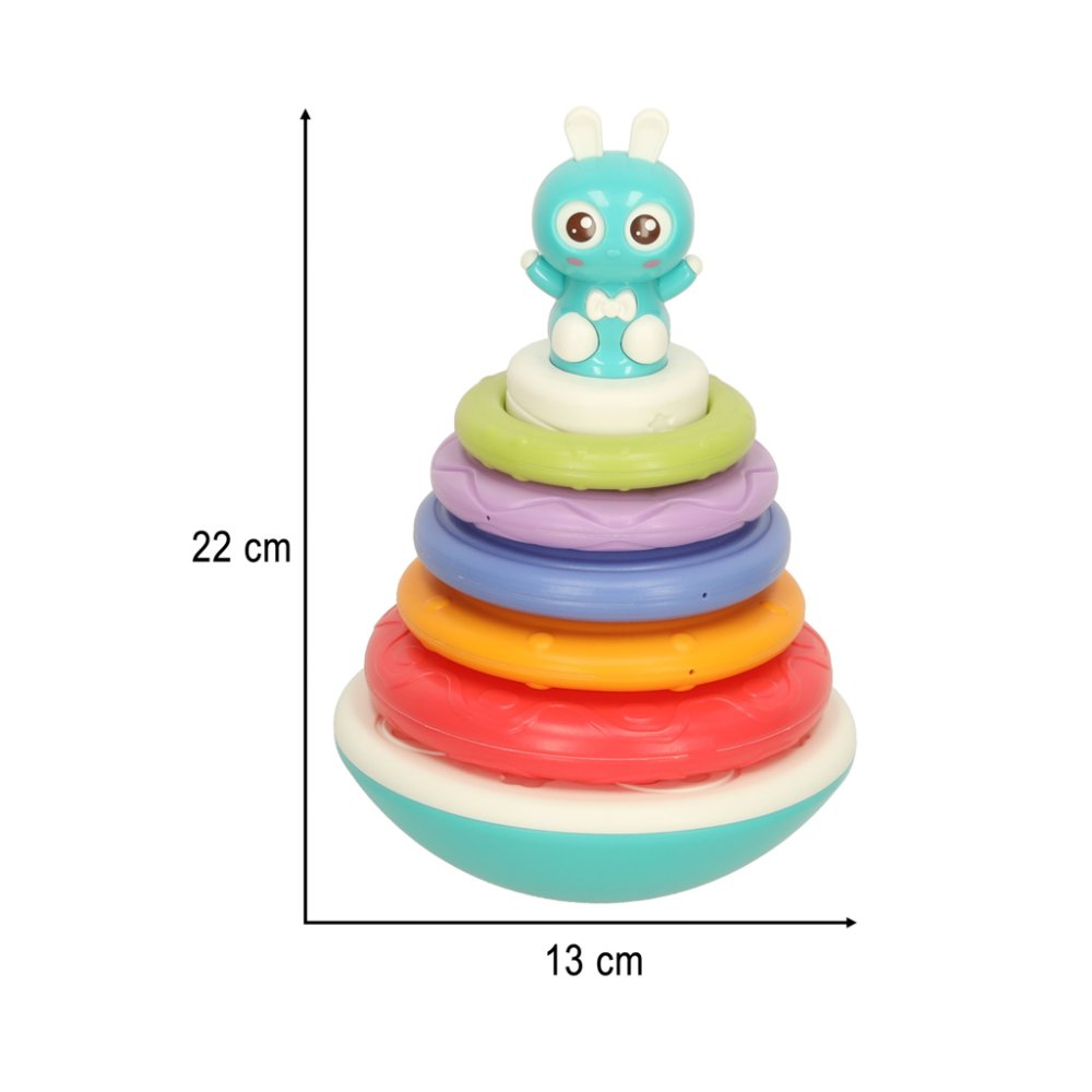The toy consists of a wobbling base featuring a little bunny friend and five rings of different sizes. The child's task is to place the rings in order to build a rainbow tower. Each time a ring is placed, the toy plays a cheerful melody, encouraging the toddler to continue playing.
