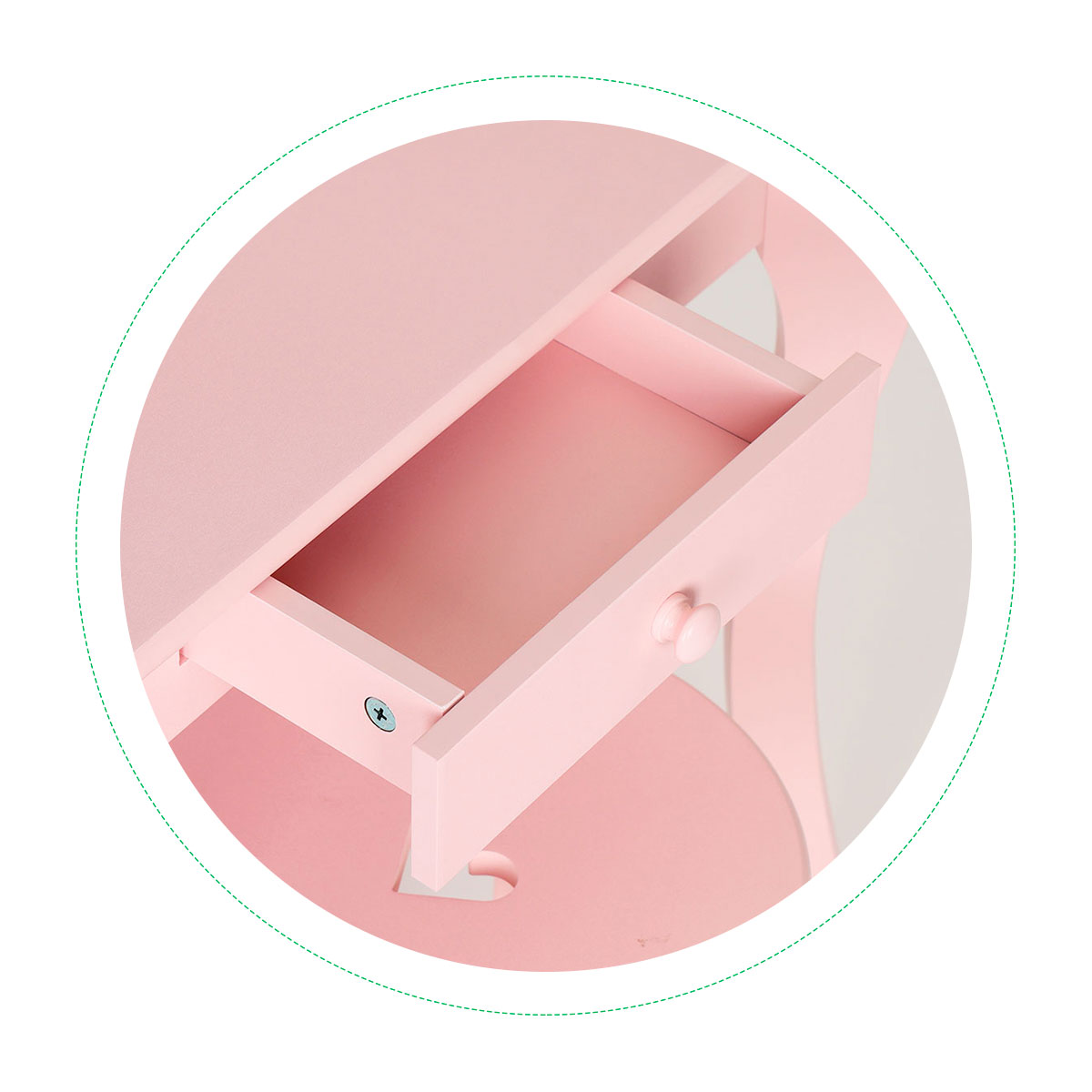 The vanity features a practical drawer where your child can store their treasures, jewelry, or play accessories. The drawer is designed to be easy to open and close, allowing your child to independently organize their little world.