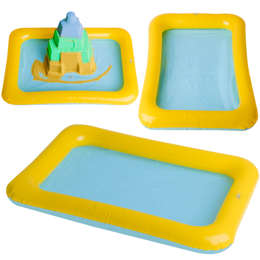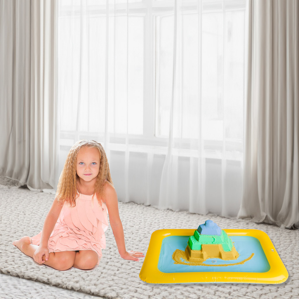 This inflatable sandbox is a great solution for creative play with kinetic sand. Your child will be able to play without worrying about making a mess, as the sand stays inside the box. It's perfect for playing with kinetic sand, salt dough, clay, and other similar materials.