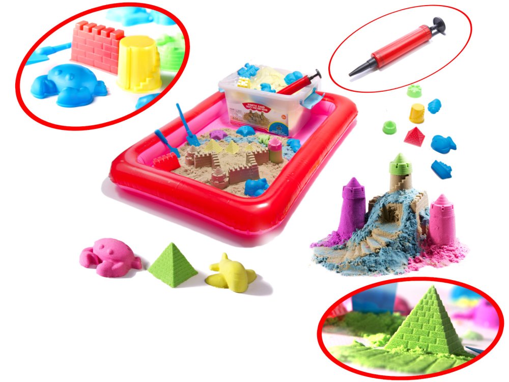 The set also includes an inflatable sandbox measuring 56 x 40 cm, which is a great addition to playing with kinetic sand.