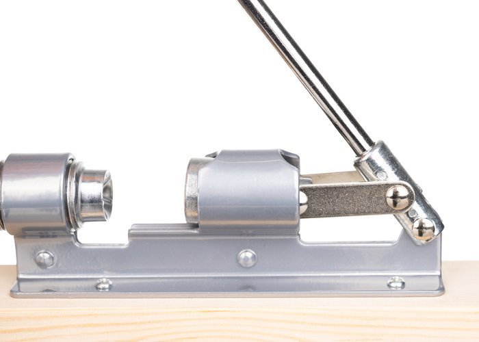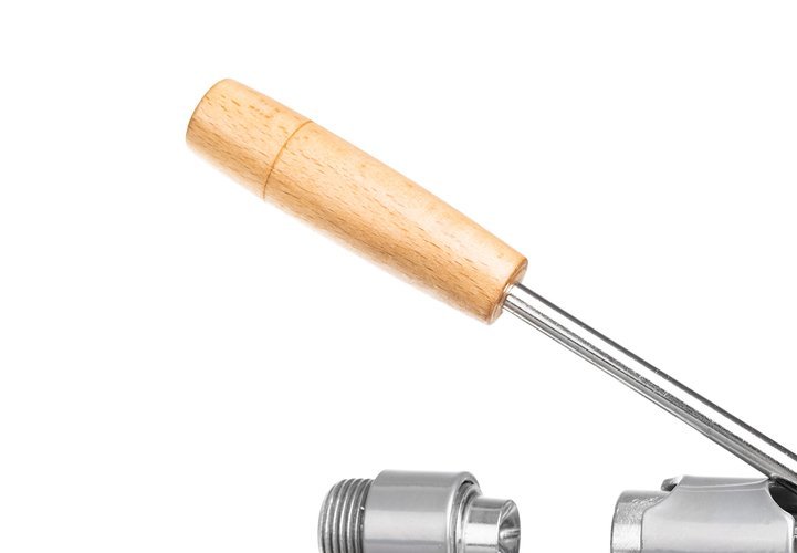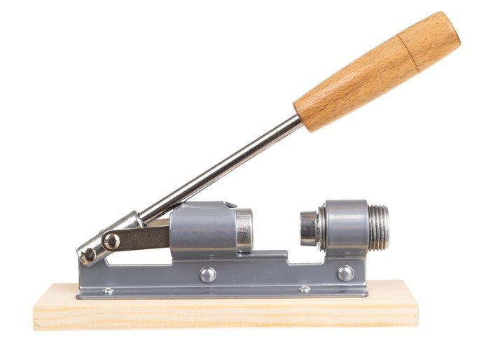Steel nutcracker on a wooden stand with an adjustable mechanism. Allows you to easily crack nuts of various sizes, providing stability and ease of use thanks to the sturdy wooden base.