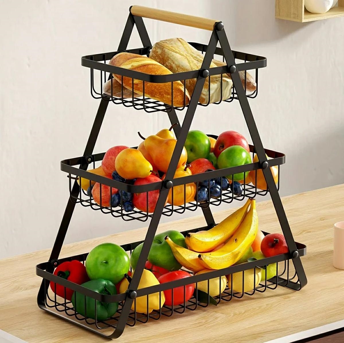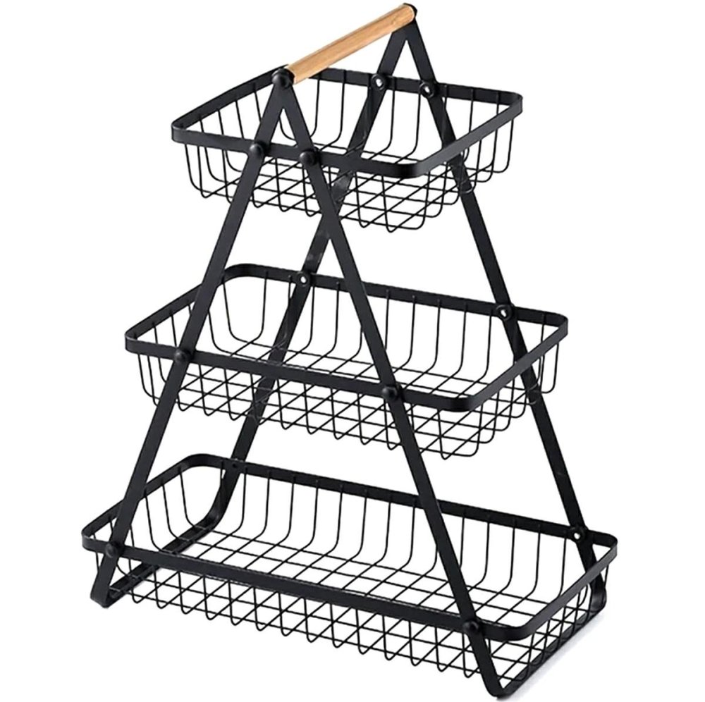 This three-tier metal basket is a practical and stylish solution for storing fruits, vegetables, or decorative items. Its vertical design helps save counter space while keeping your produce organized and easily accessible.