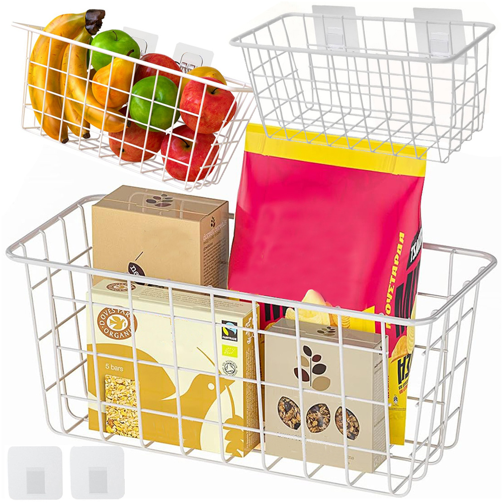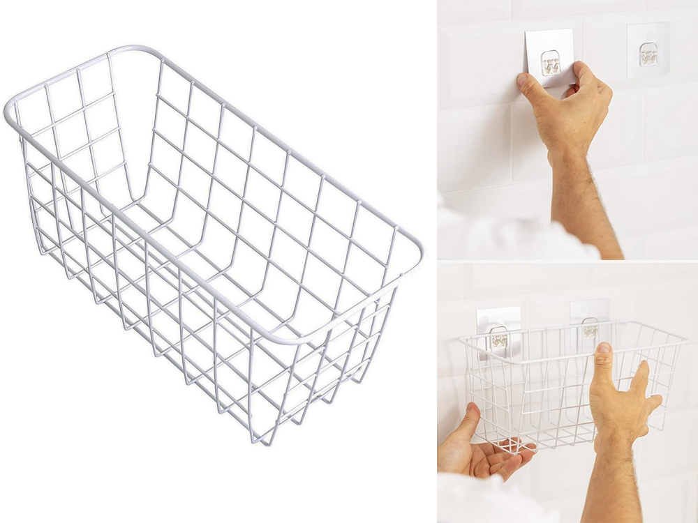 A practical and functional metal basket designed for convenient storage and organization in the kitchen, bathroom, or other rooms. Thanks to the self-adhesive hooks, it can be easily installed without drilling.