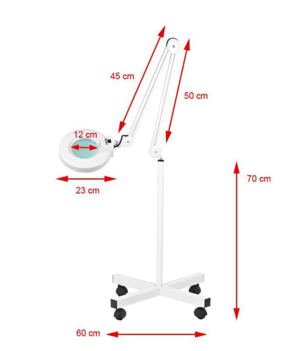 Lamp-magnifier 5 diopters, shadowless lamp on a four-arm stand. It allows you to view the skin at an enlargement with good lighting. Also used in manicure and pedicure treatments, permanent make-up, epilation. It has high visibility, anti-reflective glass and a fluorescent lamp that shines bright white light without causing eye pain during prolonged work. It is ideal for cosmetic, dental and veterinary offices and is also applicable in other industries.