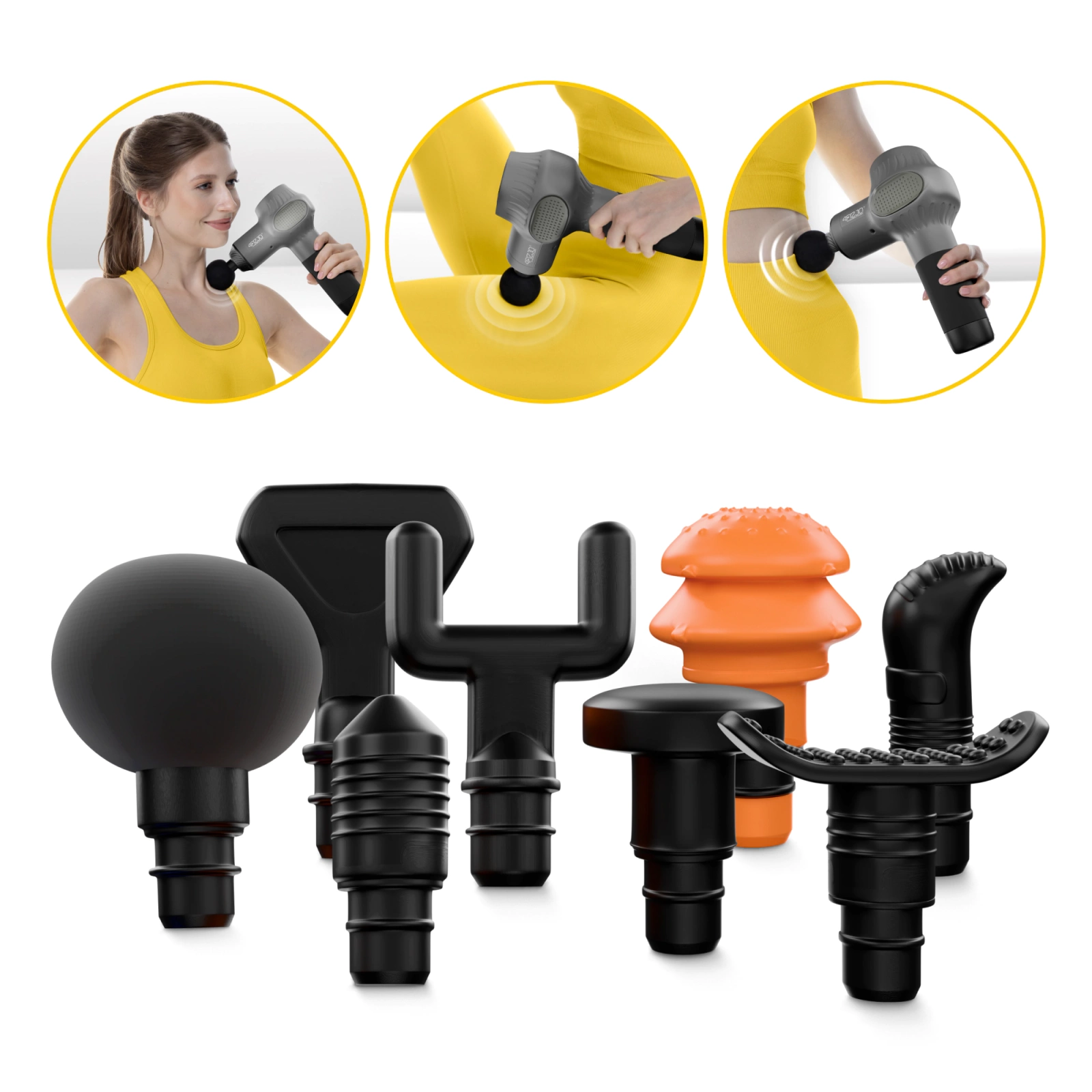 The 4Fizjo set of 8 interchangeable massage attachments is designed for deep muscle relaxation and recovery. The various heads allow for point, pressure, and vibration massage of the entire body.