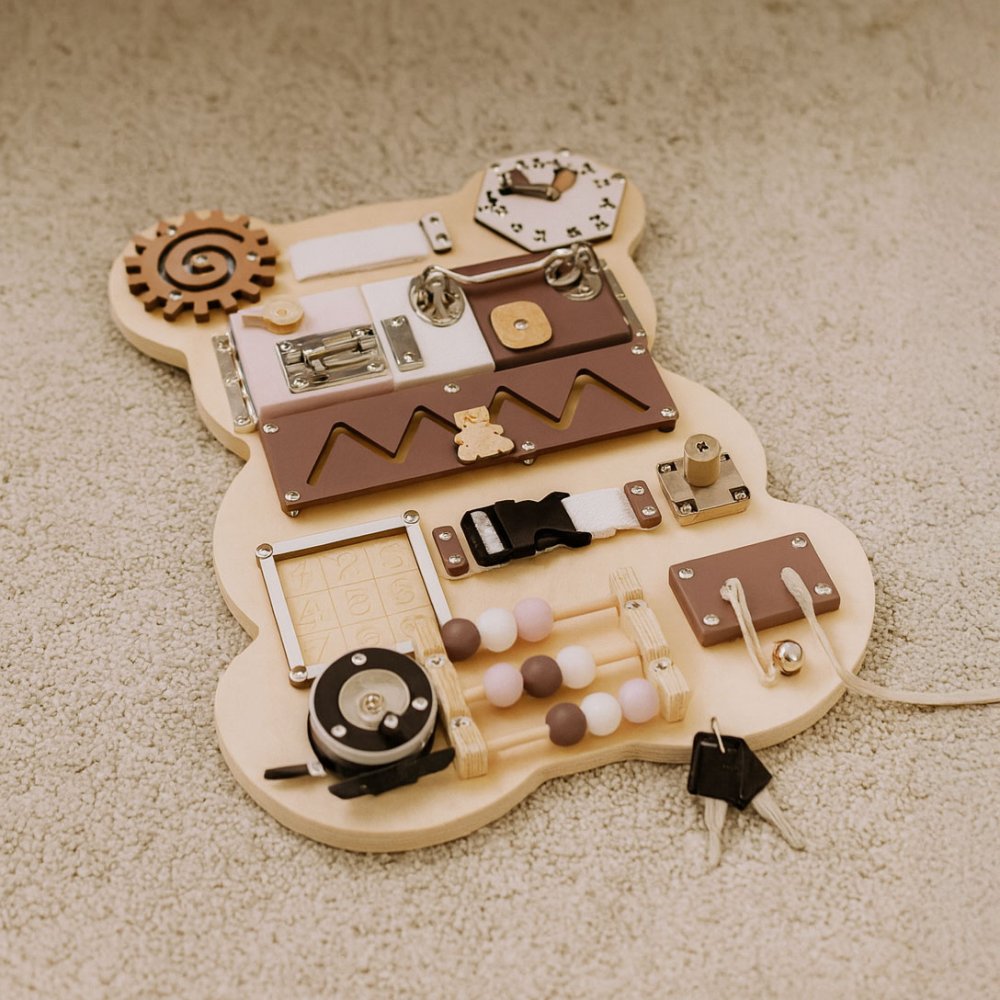Imagine your child independently opening a lock with a key, turning a gear wheel, and learning to tell time on a movable clock—all while playing! This wooden busy board, shaped like a charming bear, is not just a toy but a comprehensive tool for supporting development. With its varied textures and mechanisms, children learn the principles of cause and effect, practice patience, and enhance their manual skills. The sturdy wood and metal construction ensures durability, while its numerous features provide long hours of focused play. Make playtime smart—choose this activity board and watch your child grow!