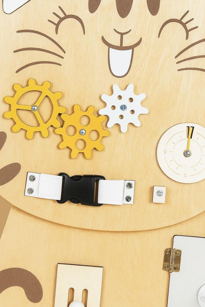 The Gotel wooden busy board in the shape of a cat is a functional and aesthetic sensory toy for the youngest children. It is equipped with various interactive elements that attract the child's attention and promote development.